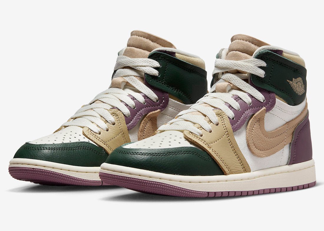 Dressed in a Galactic Jade, Desert, Sail, Sky J Mauve, and Team Gold color scheme. This offering of the Air Jordan 1 MM High comes with a unique design constructed in a mix of tumbled leather and canvas-like materials, while having a layered aesthetic. It features a Sail base with Neutral tones used on the overlays along with blank padded tongues. Other details includes the classic Air Jordan Wings logo on the ankle, Nike branding on the insoles and outsole with thick tumbled leather and stitched Swooshes on the sides. A two-tone rubber sole completes the design.