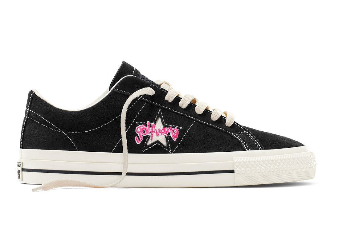 The One Star Pro’s upper is available in Blue Glow, Barbados Cherry, Potting Soil, Evergreen, Natural Ivory, and Converse Black. Select from five GOLF WANG-themed logos for the lateral side, along with various midsole graphics. The left heel boasts a GOLF WANG logo, while the right heel showcases a Converse CONS logo. Lace colors and rubber come in Egret or Converse Black, and the outsole offers Blue Glow, Egret, or Converse Black.