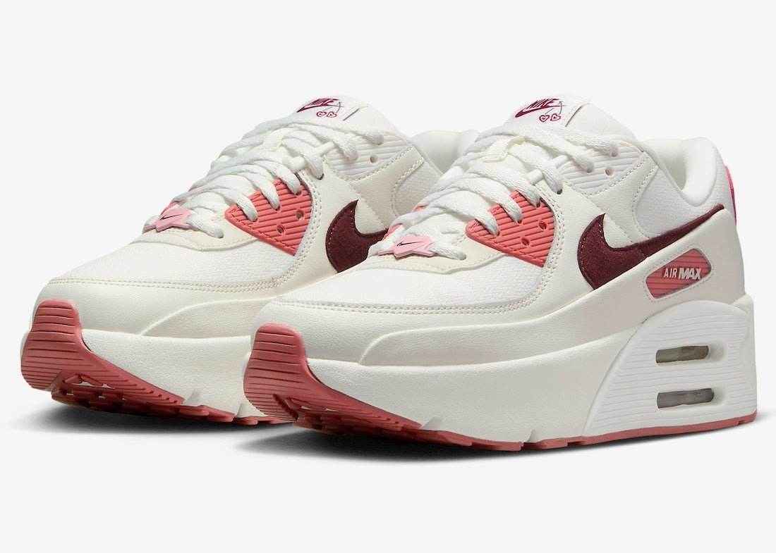 Decked in Sail, Dark Team Red, Adobe, and Medium Soft Pink hues, this Air Max 90 edition blends textile mesh, leather, and suede. Valentine’s Day touches include heart-shaped lace dubrae and heel logo, as well as cherry-themed Nike branding on the tongue, adding love to the design.